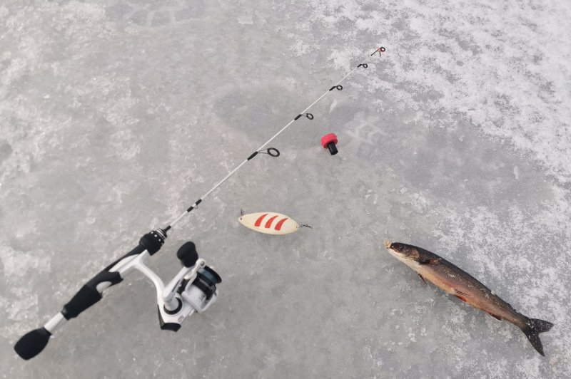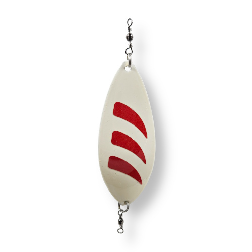 Isfiskebua sin egenutviklede og unike røyeblink i aluminium. I gamle dager ble skall fra fersvannsmusling brukt for å få en lett blink . Aluminium er et utfordrene materiale å bearbeide, men gir en lett blink som skjener langt ut. Spennende hvit og rød fargekombinasjon som skaper nyskjerrighet hos fisken. Denne lette røyeblinken i aluminium har en lokkende gange i vannet og skjærer ofte ut til siden, for deretter å vrikke seg tilbake til senter. Fisken tar ofte når skjea stopper opp. Derfor er det lurt med en pilkerytme hvor du holder litt stille før neste drag. Anbefaler at det fiskes med en tungstenflue eller mormyshka under slik at du har maksimal følsomhet.