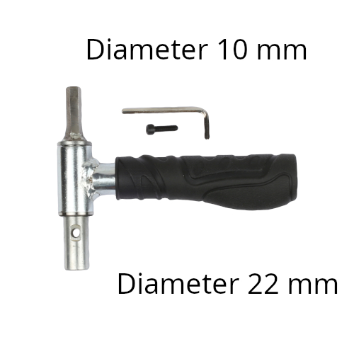 Håndtaket på adapteret vil hindre i at drillen kan slå rundt hvis boret setter seg fast og er en ekstra sikkerhet. Settet består av selve adapteret + unbrakonøkkel med skrue.