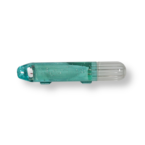 Blå lysblink med kraftig blink i kontakt med vann som fisken ser på langt hold. Virketid ca. 150 timer. Festepunkt for snøre både på siden og topp som gjør at du kan feste blinken nederst hvis du fisker med opphengerfluer eller valgfritt på sena både over eller under en lokkeskje ved å bruke hullene på siden. Vår favoritt er å feste lysblinken på sena ved å tre gjennom sidehullene 2 ganger og så feste en mormyshka eller tungstenflue 10-15 cm under dette. Vekt 13 g. Kan også brukes på lett pilkestikke. Under ser du forskjellen i størrelse mellom en standard lysblink og denne. Etter vår mening er dette en lysblink du kan fiske med eller sette ut som et lokkelys som man fisker rundt.