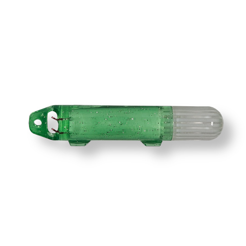 Grønn lysblink med kraftig blink i kontakt med vann som fisken ser på langt hold. Virketid ca. 150 timer. Festepunkt for snøre både på siden og topp som gjør at du kan feste blinken nederst hvis du fisker med opphengerfluer eller valgfritt på sena både over eller under en lokkeskje ved å bruke hullene på siden. Vår favoritt er å feste lysblinken på sena ved å tre gjennom sidehullene 2 ganger og så feste en mormyshka eller tungstenflue 10-15 cm under dette.