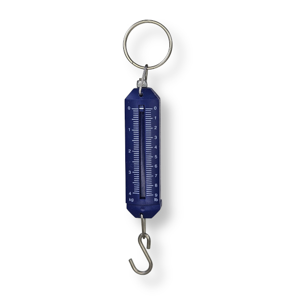Enkel men funksjonell liten blå fiskevekt som lett får plass i pilkedunken.