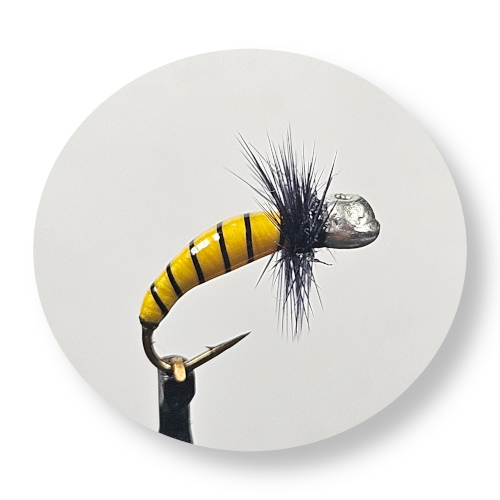 Tinnhodenymfe laget på Caddiskrok 8. Markant gul kropp med svart ribbing. Svart bust og blankt hode som kan tusjes i ønsket farge. Leveres på ferdig bundet tafs og fiskes med kroken opp.